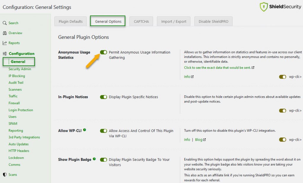 To change your preference go to the menu option: Shield → General. In the page that loads, there will be a tab called ‘General Options’ and therein is the option to enable or disable tracking. Simply check the box on or off as desired, and save.